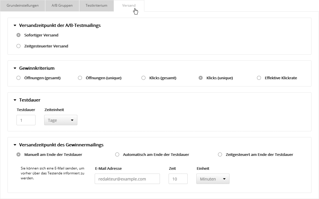- Manuell am Ende der Testdauer: unsere Mailingl√∂sung zeigt den Gewinner des A/B-Tests an. Sie entscheiden jedoch selbst, welches der Mailings "Ihr" Gewinner sein soll. Sie wählen das Mailing aus, dass an die noch ausstehenden Abonnenten verschickt wird, inkl. Versandzeitpunkt (sofort oder zeitgesteuert). Um vor Ende des ablaufenden A/B-Tests rechtzeitig informiert zu werden, können Sie optional eine E-Mail-Adresse und eine Vorlauf-Zeit eintragen.