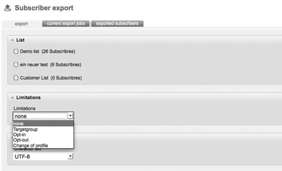 Subscribers lists can be exported from unsere Mailingl√∂sung as CSV – files. An advantage, for example, is that you can back up the address lists in this way. In the tab 'Export’, you can make choices of the lists that have to be exported. Per export only one subscriber list can be chosen. If you only want to export certain data records, you can decide on 'Limitations’. |