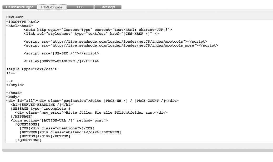Insert your entire html source code. By creating a new template, unsere Mailinglösung generates a sample html source code with all important survey-placeholders automatically in this tab.