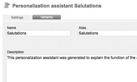 Here you enter detailed definitions of your personalizations. Click 'create variants' to open a new tab, where you can enter your wanted settings. Create your title by using the 'input assictance' into the name-field. Take a look at our example 'Hello [Vorname]':