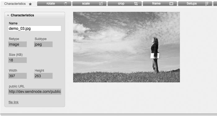Characteristics: Here you get an overview about your saved information like name, filetype and image size. You can change the name or copy the file-link (e.g. for including this image into your newsletter).