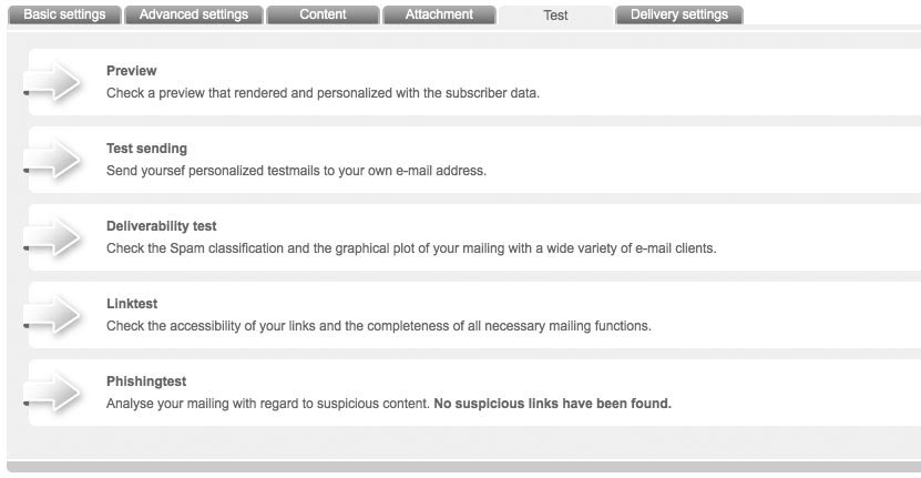 Having finished your newsletter, unsere Mailinglösung offers you numerous testing possibilities. This helps you to optimize your mailing and achieve maximum success before actual dispatch. You can get to the testing functions by choosing the tab 'Test' in the menu in which you edit your mailing. Following tests are available: |