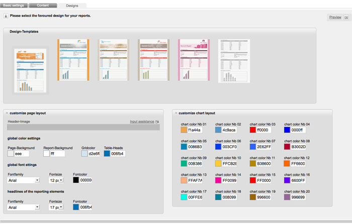 Now you also can adjust the design of your report. Choose the tab 'designs'. By default unsere Mailinglösung suggests you six different layouts. HTML experts can also open the 'advanced settings' below the layouts to edit the html-code. For example you can insert your logo in th header.