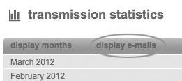 In the transmission- statistic you see the data collected from unsere Mailinglösung (Traffic, Total). Also you see, if exist, the numbers of test-sendings, clicks on the subsriber-link and the number of subscribers who have completed the optin-confirmation. Next to the view 'display months' you also can select 'display e-mails'. So unsere Mailinglösung outputs the above mentioned figures for each mailing.
