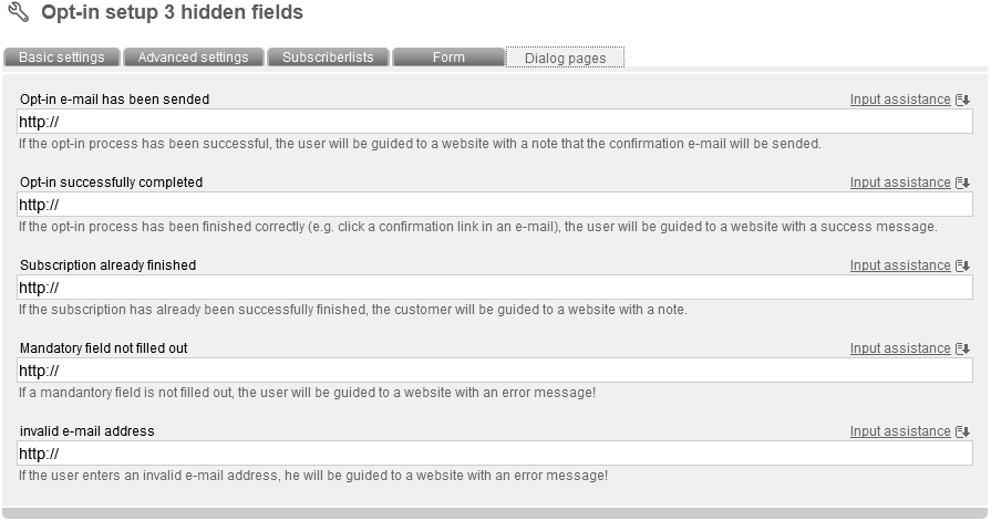 Now enter a name and an optional description for your optin setup. Then choose the 'mode' (important). The following modes are supported by 'unsere Mailingl√∂sung': Double Opt-in with confirmation e-mail (recommended as the only legally secure login variant): Interested party visits a website with an optin setup form. He enters his data into the form. He gots an e-mail with content like this: „Thank you for your optin. Please confirm the registration confirmation link to complete your registration.“ He clicks the link. Registration is completed. He gots a „welcoming“ e-mail. You can integrate information about your company and a certain design as well. Double Opt-in: Like described before, but without sending of a „welcoming“ e-mail. Confirmed Opt-In: Nach Anmeldung auf der Webseite wird sofort eine automatische Begrüßungsnachricht versendet. Single Opt-in: No e-mails will be send. There just will be a message in your browser, that registration was successfull. According to the mode you've choosed, you have to adapt different sub-options. In Tab 'advanced settings' you can deposit your e-mail address in field 'e-mail forwarding', to be informed about new subscribers. In field 'mailing for later delivery' you can determine your last sended newsletter. All new subscribers will receive your last mailing and don't have to wait for another one. To protect your optin-form against abuse, activate the invisible captcha . Captchas are often used to check if petitions are produced by a machine (robot, short: bot) or a real person. Bots are often used abusive to generate masses of subscriptions. Choose your favorite subscriberfields, which should be filled in in next tab 'Form'. After clicking 'Add subscriberfield' a pop up appears, where you can select and add subscriberfields to your optin-form. Furthermore you can add one or more subscriberlists as option(s) in a ceckbox through the button 'add subscriberlist'. Click 'sort formfields' to edit order of your fields. Click 'test form' to check your form by a preview of your optin-form. Next tab: 'Dialog pages':