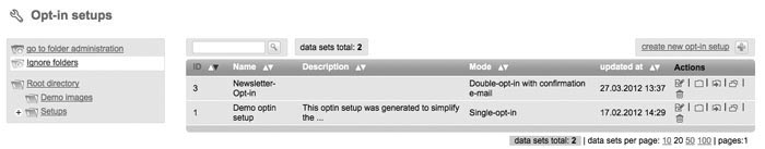 Through 'Setups' and 'Optin Setup' you can create forms, which can be included into your website. So interested parties can login automatically on your website for your subscriberlist(s). Please note: Requirement for a successfull 'optin setup' is to create an e-mail with type 'dialog mailing' for registration confirmation and welcoming, which got the status 'activated'. Otherwise those mailings will be lacking in the shortlist of mailings which you can choose for your optin setup. For an esier start unsere Mailingl√∂sung gots a „Demo optin setup“ for you. Created optin setups can be 'opend' afterwards for editing, 'moving' to another folder or 'deleting'. If you have moved an optin setup into another folder, click 'open folder' to get into. Create new Optin setup |