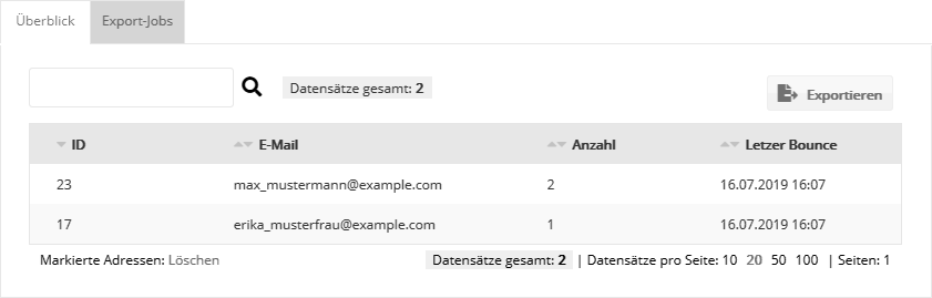 Reiter 'Überblick'Hier werden alle E-Mail-Adressen aufgelistet, deren Versendungen aufgrund von drei aufeinanderfolgenden Hardbounces zurückgehalten werden. Diese Adressen werden auf der unsere Mailingl√∂sung-internen 'Retained List' gesammelt. Verwaltet werden hier ausschließlich die reinen E-Mail-Adressen, unabhängig von den dazugehörenden (eventuell ehemaligen) Abonnenten. Oben rechts können Sie mit Klick auf den 'Exportieren'-Button die zurückgehaltenen E-Mail-Adressen als CSV-Datei exportieren. Die erzeugte CSV-Datei lässt sich anschließend auf dem Reiter 'Export-Jobs' herunterladen.