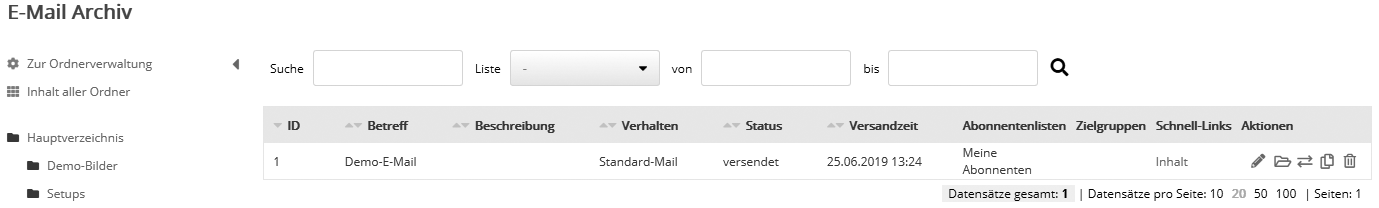Um die Funktion zu demonstrieren, ist in unsere Mailingl√∂sung bereits eine "Demo-E-Mail" im Archiv vorhanden. Über die Spalte 'Schnell-Links' gelangen Sie zum 'Inhalt' des archivierten Mailings. Es lässt sich in den Formaten HTML (Desktop) und Text anzeigen, sowie über den Button 'PDF' als PDF-Datei abspeichern. Auf der rechten Seite finden Sie die Symbole